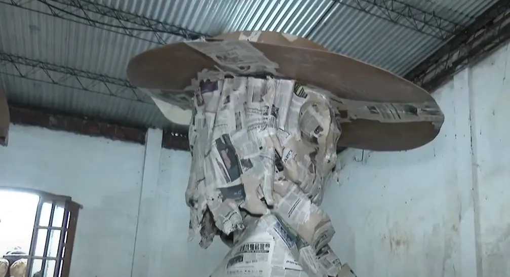 La estructura inicial de la pieza de gran tamaño es de madera y contempla al rededor de tres metros con un recubrimiento símil madera, cartón y cartapesta, con la que se van moldeando los personajes.