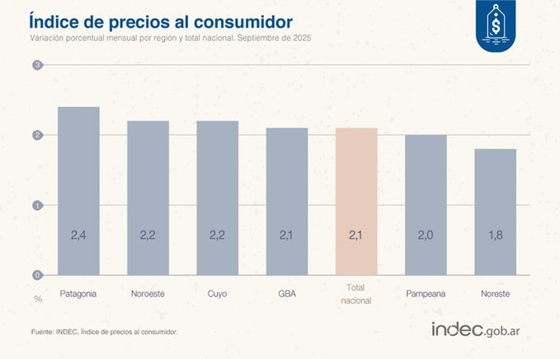 Los precios al consumidor aumentaron 2,1 % en septiembre de 2025 respecto de agosto y acumularon una inflación de 22 por ciento en los últimos nueve meses, según lo informó el Instituto Nacional de Estadísticas y Censos (Indec). La inflación de agosto había sido del 1,9%.
