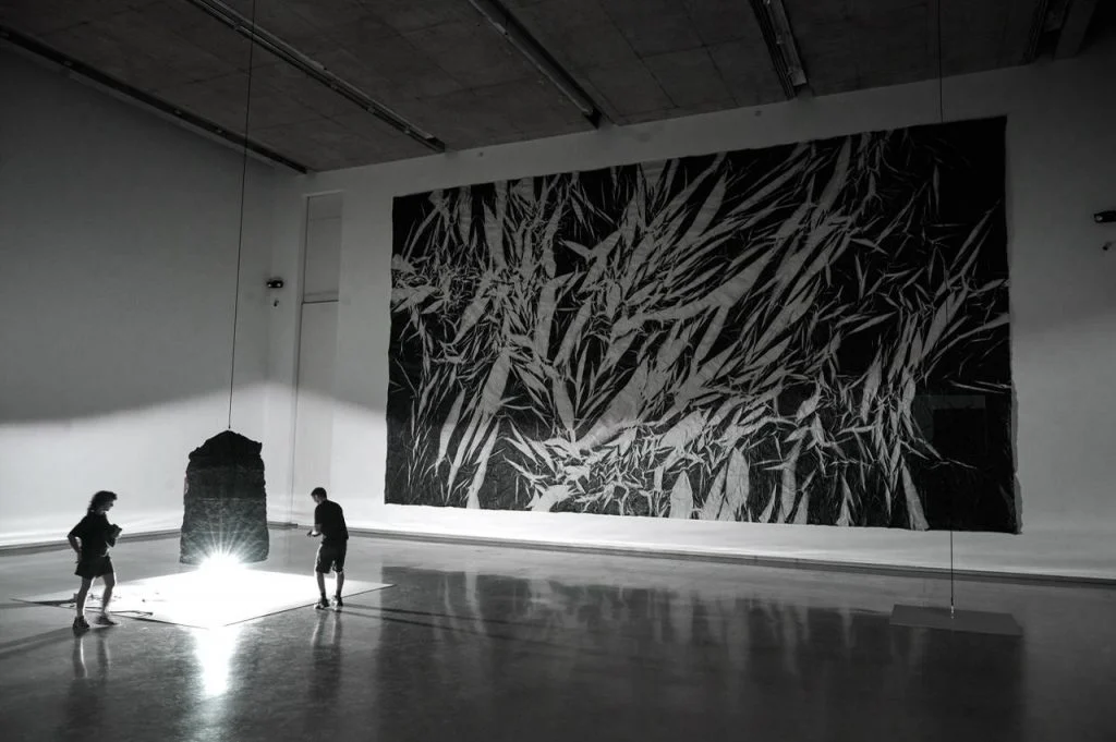 La exposición invita al visitante a situarse en una enorme sala que es iluminada por una única fuente de luz ubicada en el suelo, cerca del centro. Su resplandor alcanza cada rincón. Una campana negra de metal, accionada por un motor, una hélice y un sistema de poleas, se eleva y desciende rítmicamente sobre ella. Al cubrir la luz, sumerge la sala en una oscuridad total; al descubrirla, restituye la visibilidad de inmediato. Así, la mirada de los visitantes se interrumpe una y otra vez, y la percepción del entorno se modifica con cada ciclo. En una de las paredes laterales, un dibujo de dimensiones monumentales ocupa casi toda la superficie. La imagen abstracta, en blanco y negro, revela en sus pliegues el proceso que le dio origen. El papel fue replegado repetidas veces sobre sí mismo, aplanado y pintado de negro en toda la superficie. Luego se volvió a desplegar hasta recuperar su tamaño original, exhibiendo al mismo tiempo los planos negros pintados anteriormente y las áreas sin cubrir que permanecieron ocultas entre los pliegues. Si en proyectos anteriores la obra de Basualdo proponía una mirada introspectiva hacia el interior del cuerpo, en esta exposición la atención vuelve a dirigirse hacia afuera, al entorno en el que se mueven los cuerpos. Sin embargo, esa mirada aparece ahora accidentada: se interrumpe en su continuidad como si el espacio se plegara y desplegara entre luces y sombras.