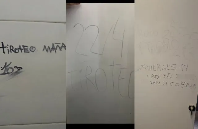 Según pudo constatarse a partir de imágenes que circularon entre estudiantes y familias, las pintadas fueron realizadas en puertas y paredes de baños escolares del Esquiú, el Instituto Huailén y el Pompeya, según pudo saber Mi8. En algunos casos, los mensajes incluyen fechas concretas y advertencias explícitas, como “22/4 tiroteo” y “viernes 17 tiroteo, van a cobrar”.